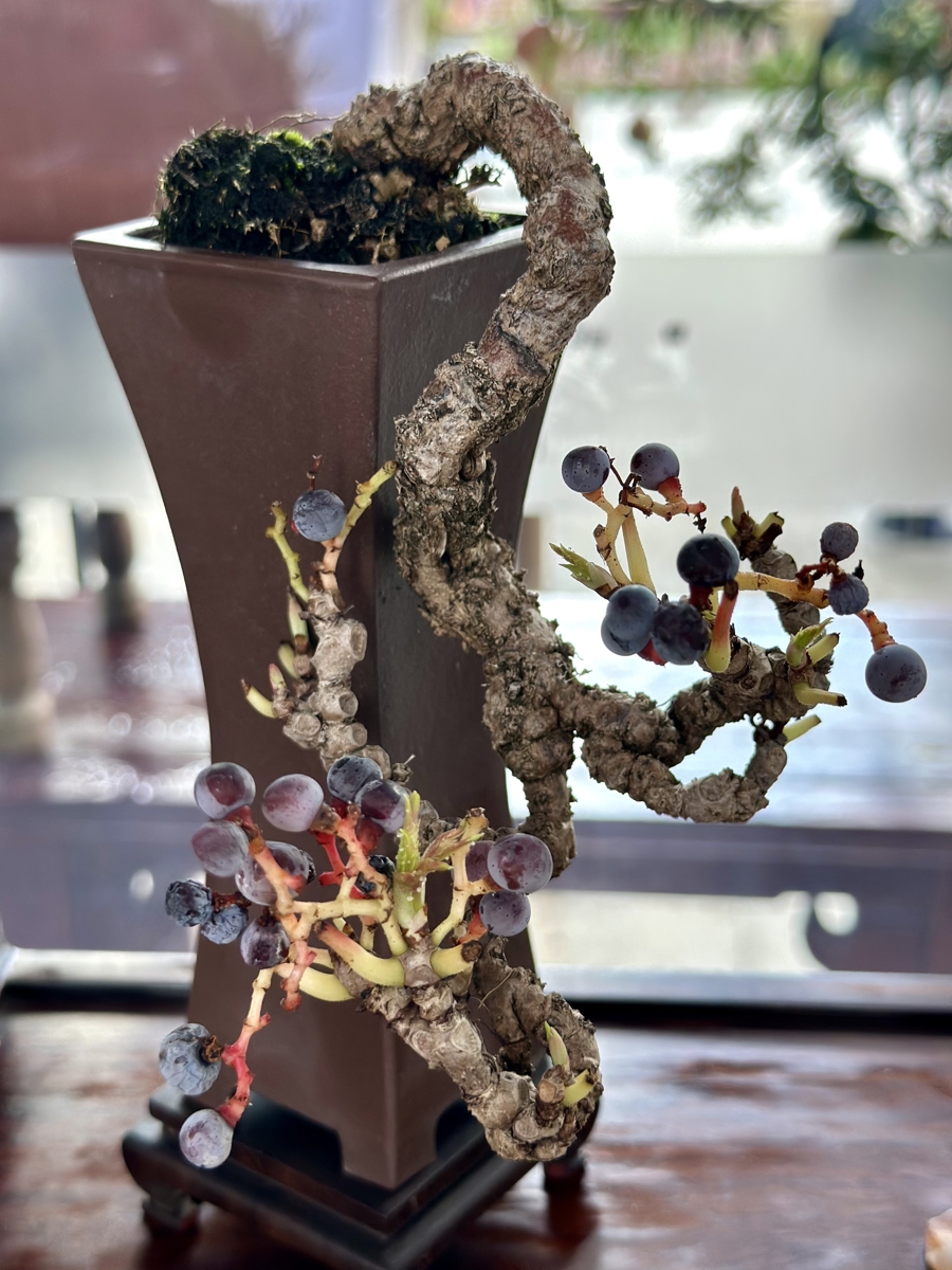 令人眼前一亮的是,一些“掌上盆景”尤为小巧可爱,吸引了很多人驻足。比如一株爬山虎盆景,寸把长、手指粗的藤条探出盆外,上面缀满一颗颗如蓝莓般的果实。整件作品高度也仅有20厘米左右,却将爬山虎自然天成的形态展现得淋漓尽致。“当时正好看到有一段弯的藤条,便将其剪下,用土包裹,四个月左右就能生根。”作者表示。